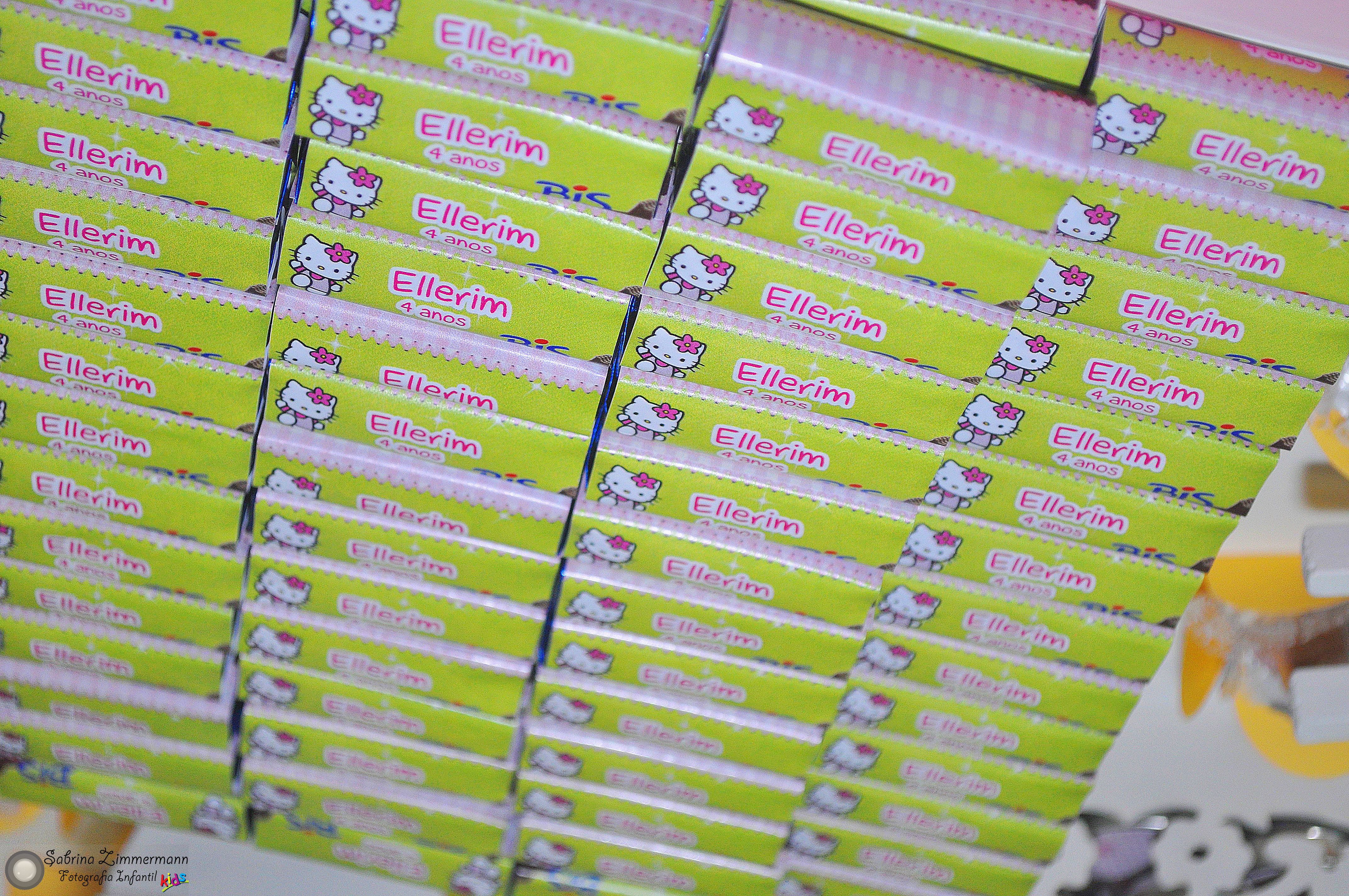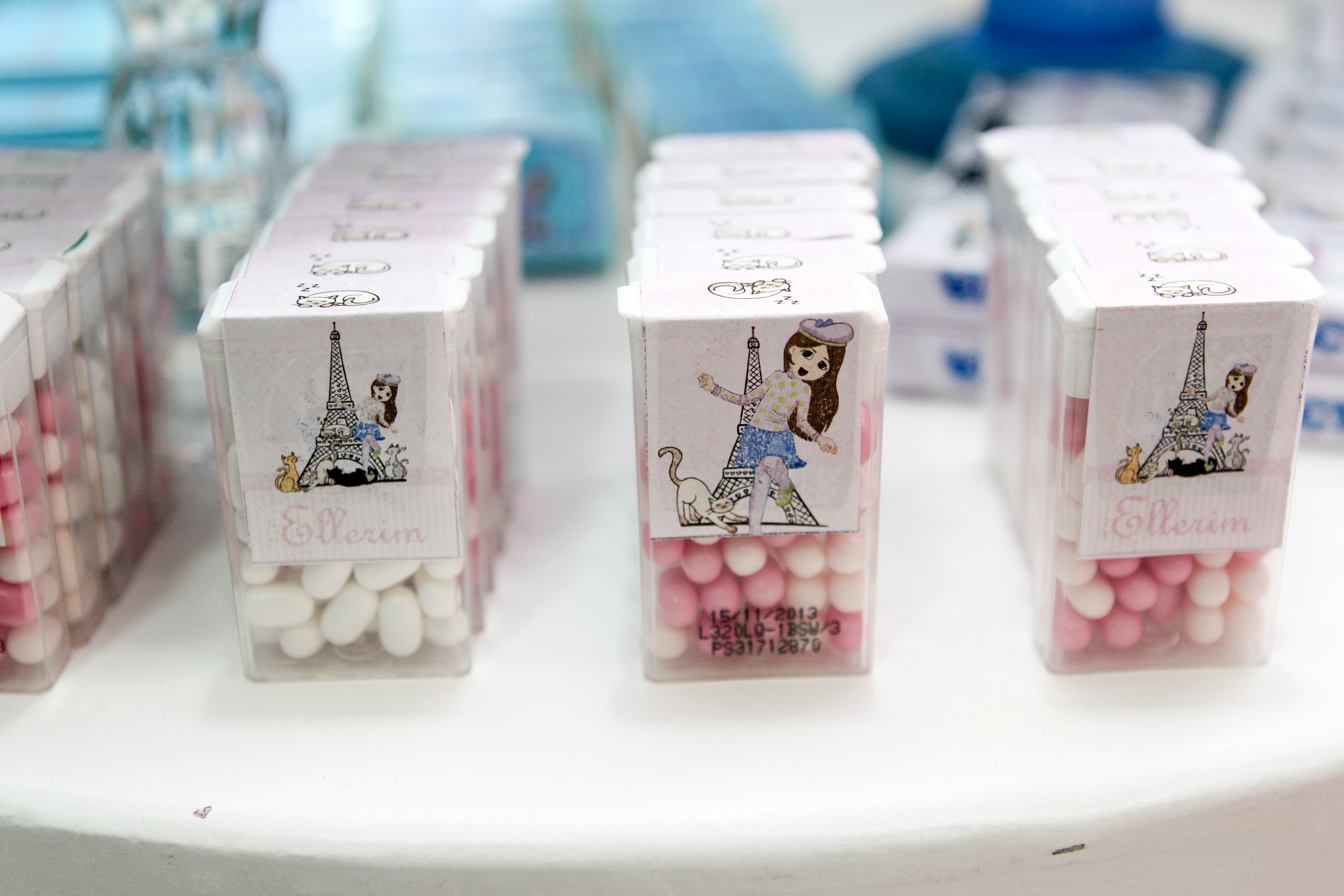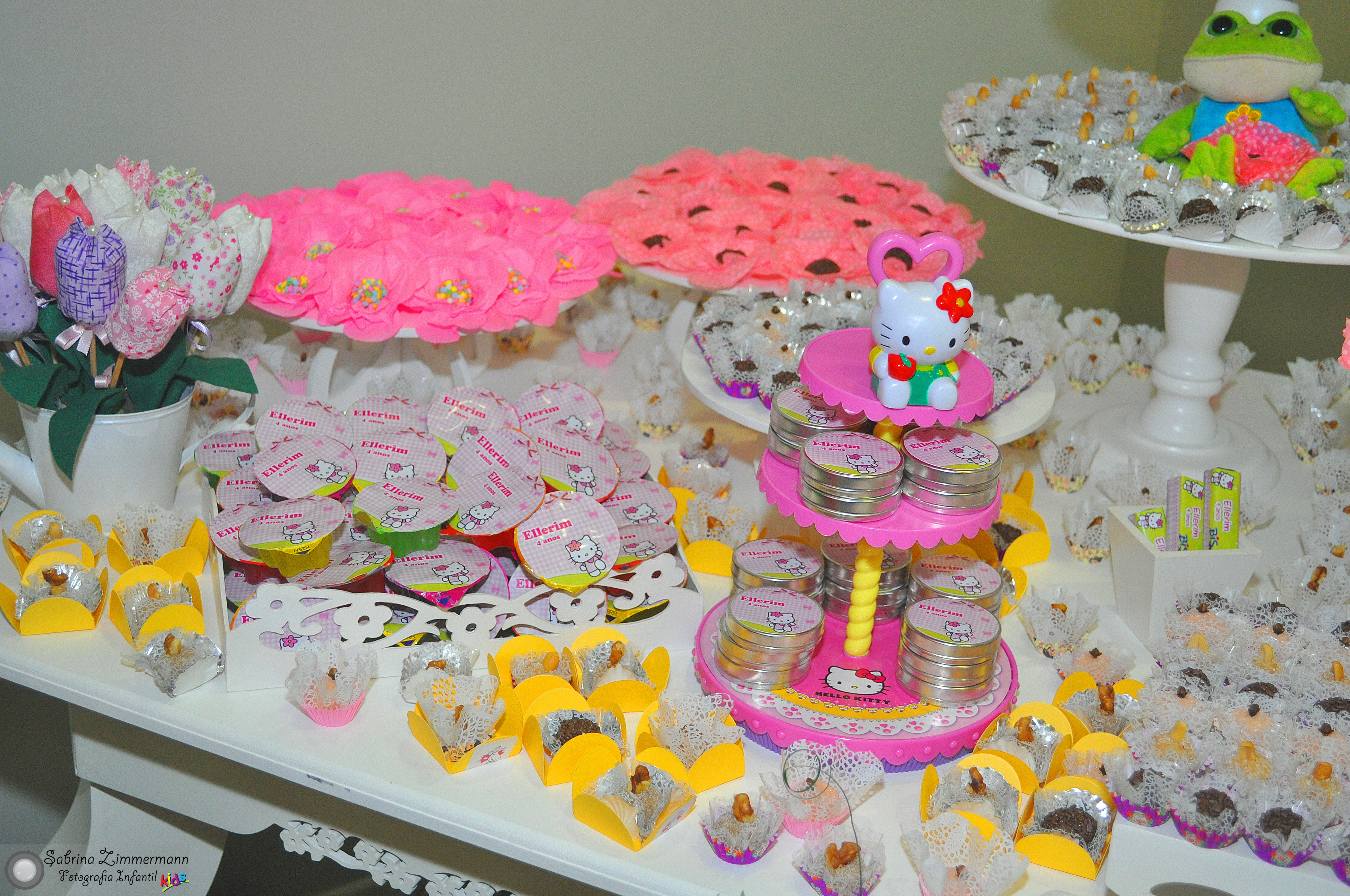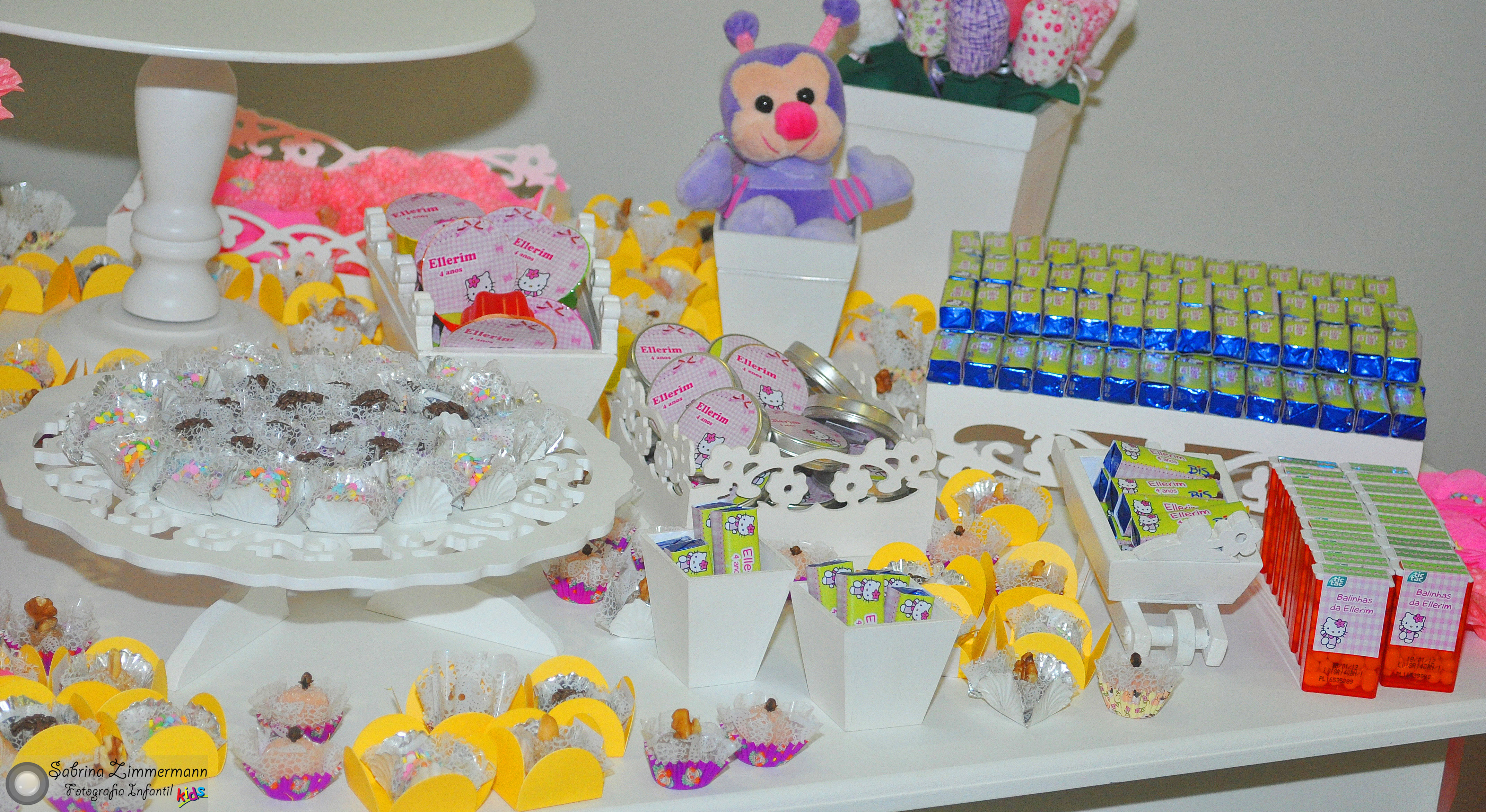 Todos os convidados amam as guloseimas personalizadas! Elas são o ponto alto da hora da sobremesa! Uma dica é deixar cada guloseima separada por tipo (e não misturar todas). Para evitar que alguns convidados pequem muitas guloseimas repetidas e outros fiquem sem, coloque apenas 50% das guloseimas enfeitando a mesa, e distribua o restante com as lembrancinhas.