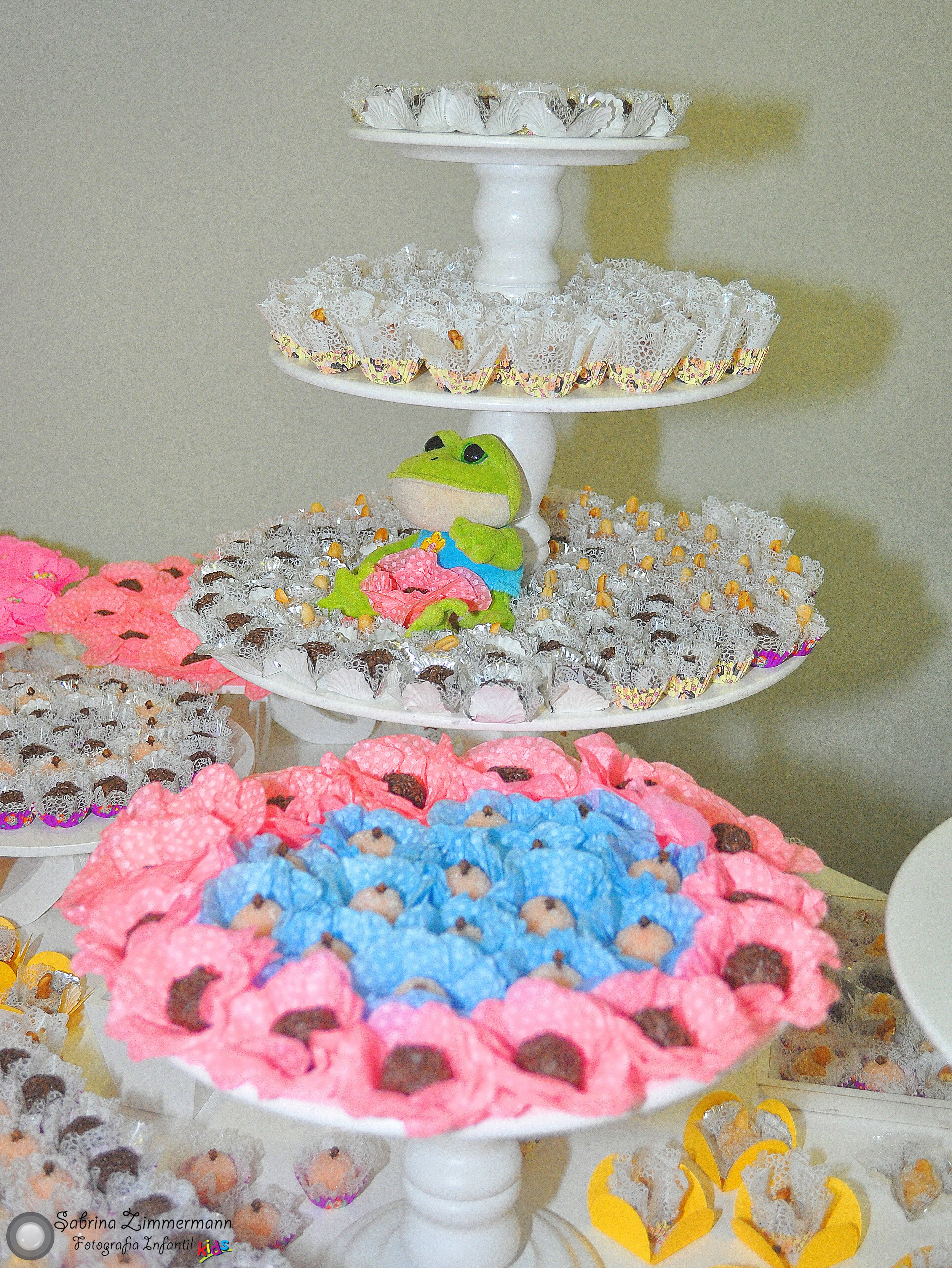 No Brasil (ao contrário dos EUA) temos o costume de ter docinhos em grandes quantidades. Eu gosto. E gosto de ter muita variedade também. Mas é preciso que os docinhos fiquem em harmonia na mesa. Para não correr o risco de deixar tudo uma bagunça, deixe algum espaço entre os docinhos diferentes. A melhor forma de fazer isso é usando bandejas, pratos e suportes! Além de ficar super chique, deixa a mesa organizada. Não precisam ser caros ou alugados. Você mesma pode usar a imaginação! Uma caixa virada ao contrário (pintada de branco ou na cor da festa), suportes feitos com pratos e copos colados, bandejas, cristais. Quanto mais neutro melhor. Você pode encontrar muitas peças de vidro, imitando cristal, nas lojas de R$ 1,99.