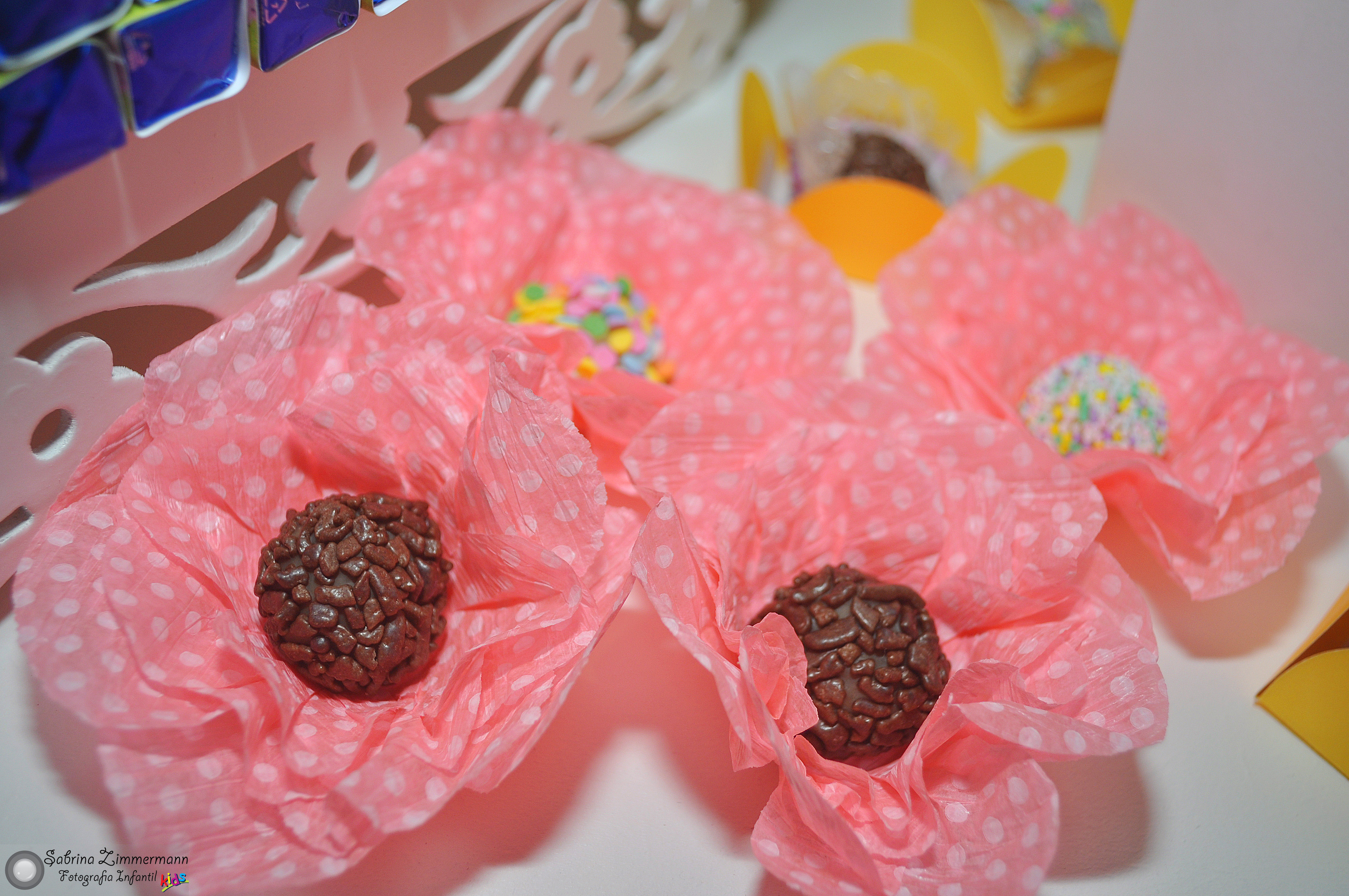 Faça forminhas personalizadas, e compre algumas forminhas quadradas (não saem tão caro) e outras de papel crepom (pode ser apenas uma caixa para dar um efeito especial). E sempre use a folha de plástico entre o docinho e a forminha. Sai muito barato, é mais higiênico e dá um efeito incrível!