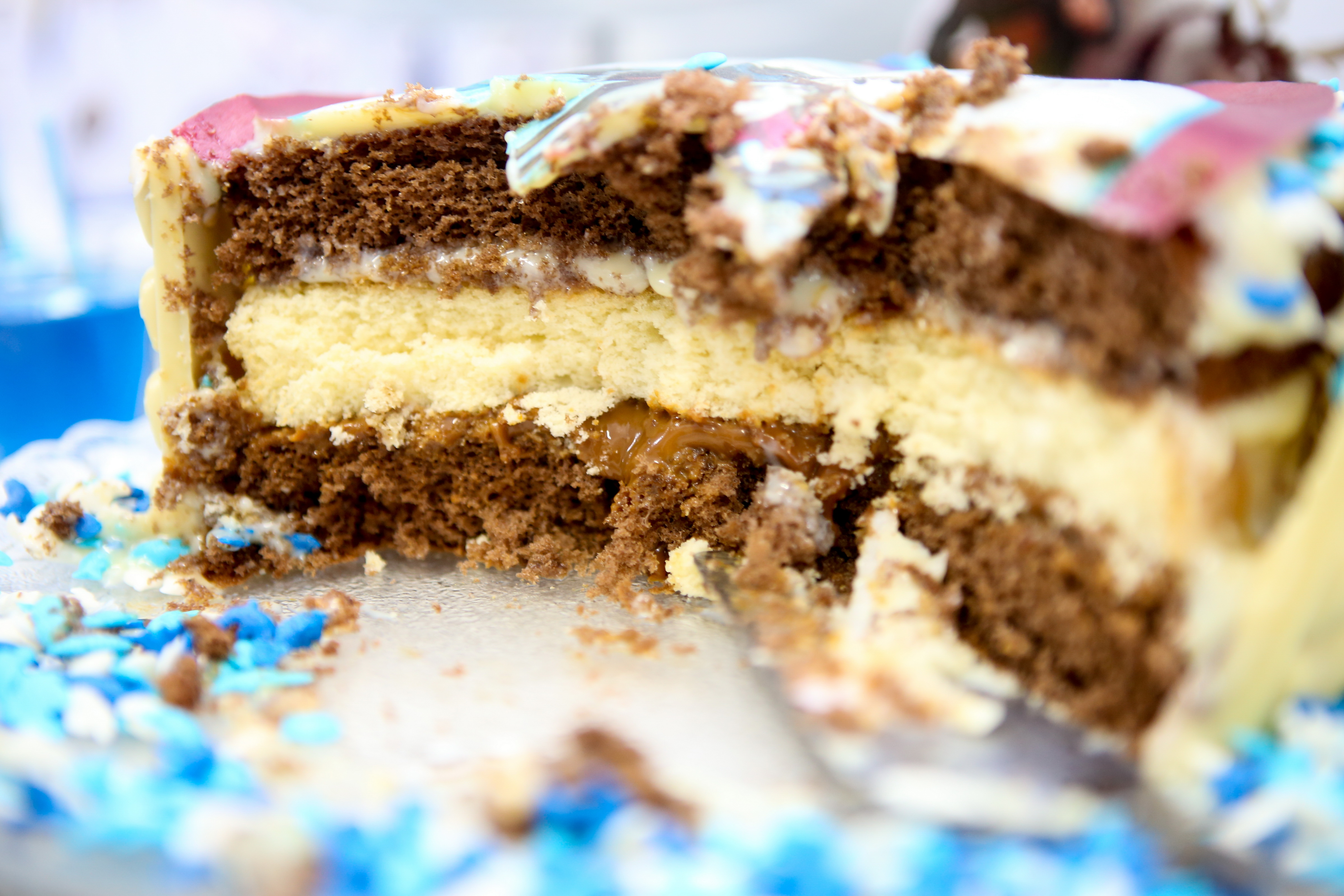 Aqui fiz uma camada de pãp-de-ló no meio entre o bolo de choolate, e recheio de brigadeiro branco e doce de leite.