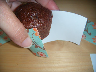 Agora aqui tem uma ótima dica, quando os wrappers forem mais largos na altura. Passe o wrapper ao redor do cupcake, deixando o bolinho bem para cima, com uma sobra de papel embaixo: