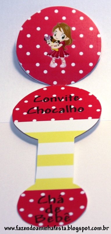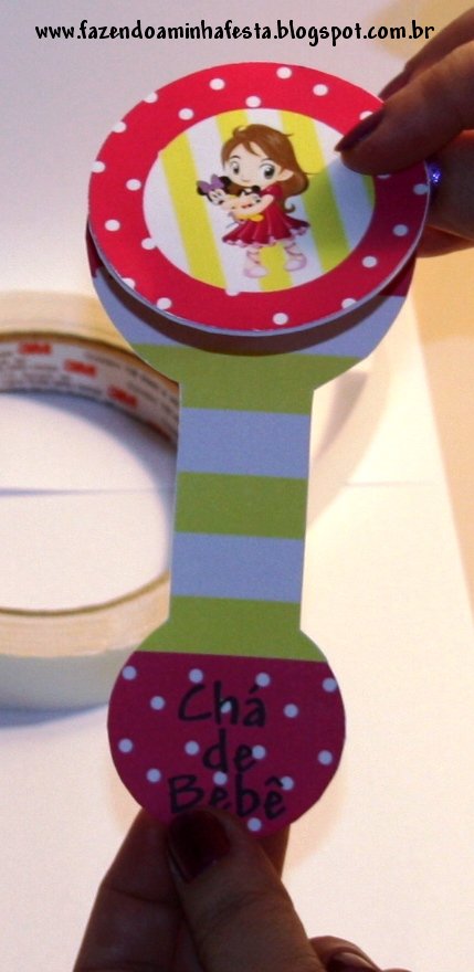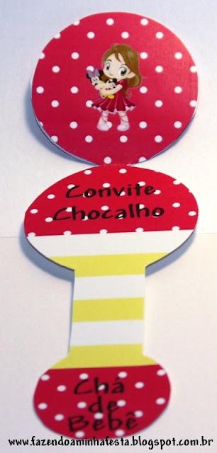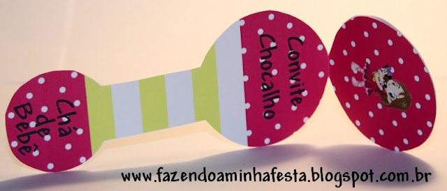 Fica uma gracinha, e é uma opção bem baratinha. Você pode escrever os dados da festa na parte de cima, e a opção do presente na parte de baixo do chocalho! Nós vamos publicar vários moldes decorados desse chocalho nos próximos dias, tanto para meninos quanto para meninas.