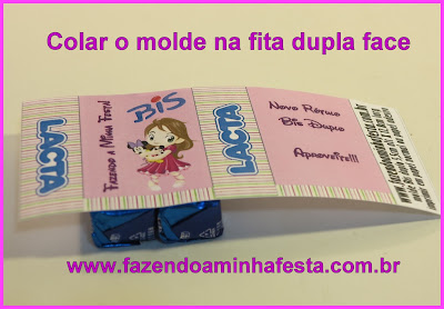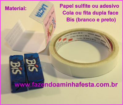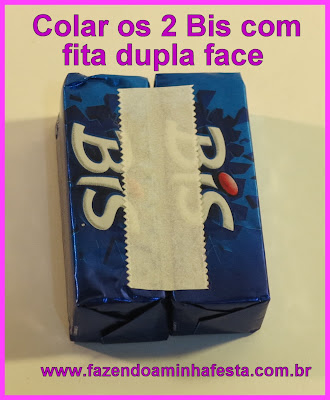 3) Cole uma fita dupla face para manter os Bis juntos, e para fixar o rótulo na embalagem: