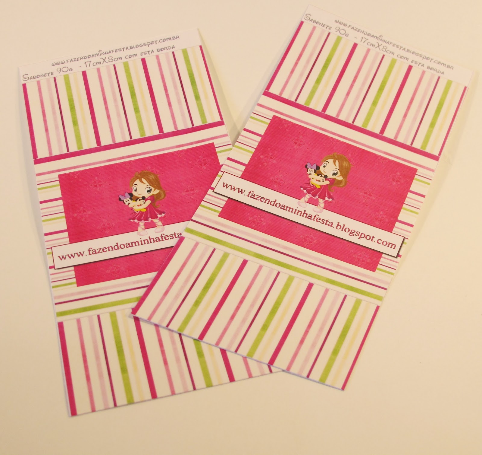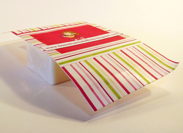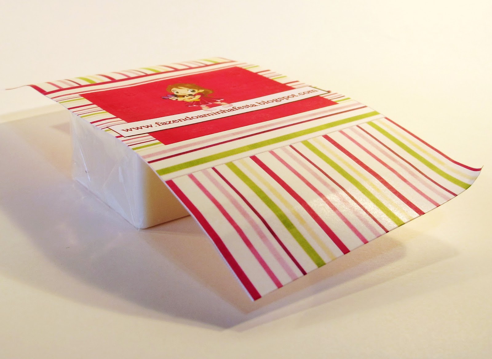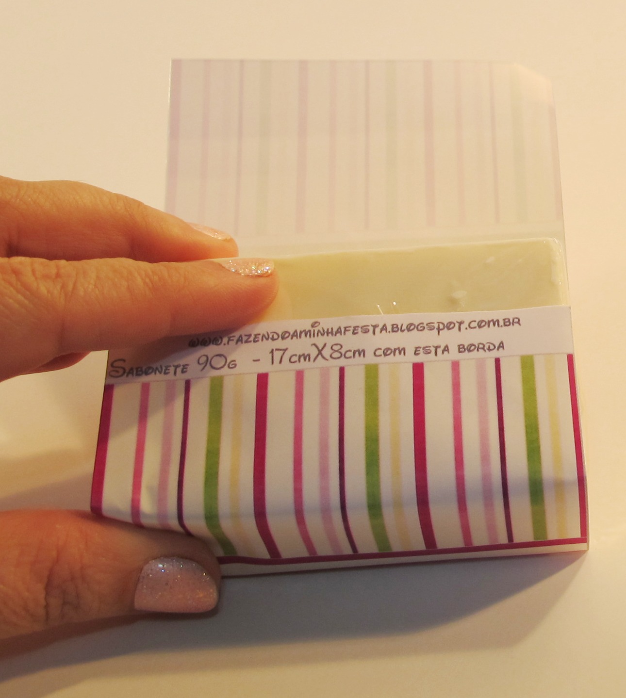 Colar o molde em cima do sabonete (não tirar a embalagem original, ou se tirar embrulhar antes com plástico transparente antes de colar o rótulo decorado, como na foto!