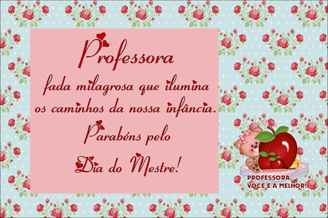Gente, o dia do Professor está chegando!!! Dia 15 de outubro!!! Hoje temos estes lindos cartões com uma linda mensagem para o dia do professor! “Professora, fada milagrosa que ilumina os caminhos da nossa infância. Parabéns pelo Dia do Mestre!”.ou“Professor, você é o Melhor!” As imagens podem ser impressas em qualquer tamanho em papel A4, ou reveladas como foto tamanho 10X15cm. ...