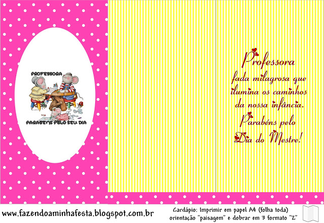 Gente, o dia do Professor está chegando!!! Dia 15 de outubro!!! Hoje temos estes lindos cartões com uma linda mensagem para o dia do professor! “Professora, fada milagrosa que ilumina os caminhos da nossa infância. Parabéns pelo Dia do Mestre!”.ou“Professor, você é o Melhor!” As imagens podem ser impressas em qualquer tamanho em papel A4. PARA APRENDER A IMPRIMIR E MONTAR ...