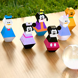 Esse boliche é super divertido. Os pinos são o Mickey e seus Amigos. É só imprimir em papel gramatura 180, recortar e colar. Como lembrancinha, imprimir, colocar em um saco transparente com uma tesoura e uma cola bastão (para ficar mais legal ainda, colocar tesoura e cola do Mickey!). Fechar o saquinho com um adesivo personalizado com o tema e ...