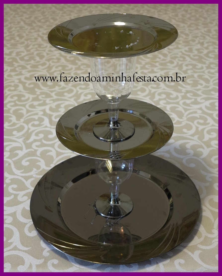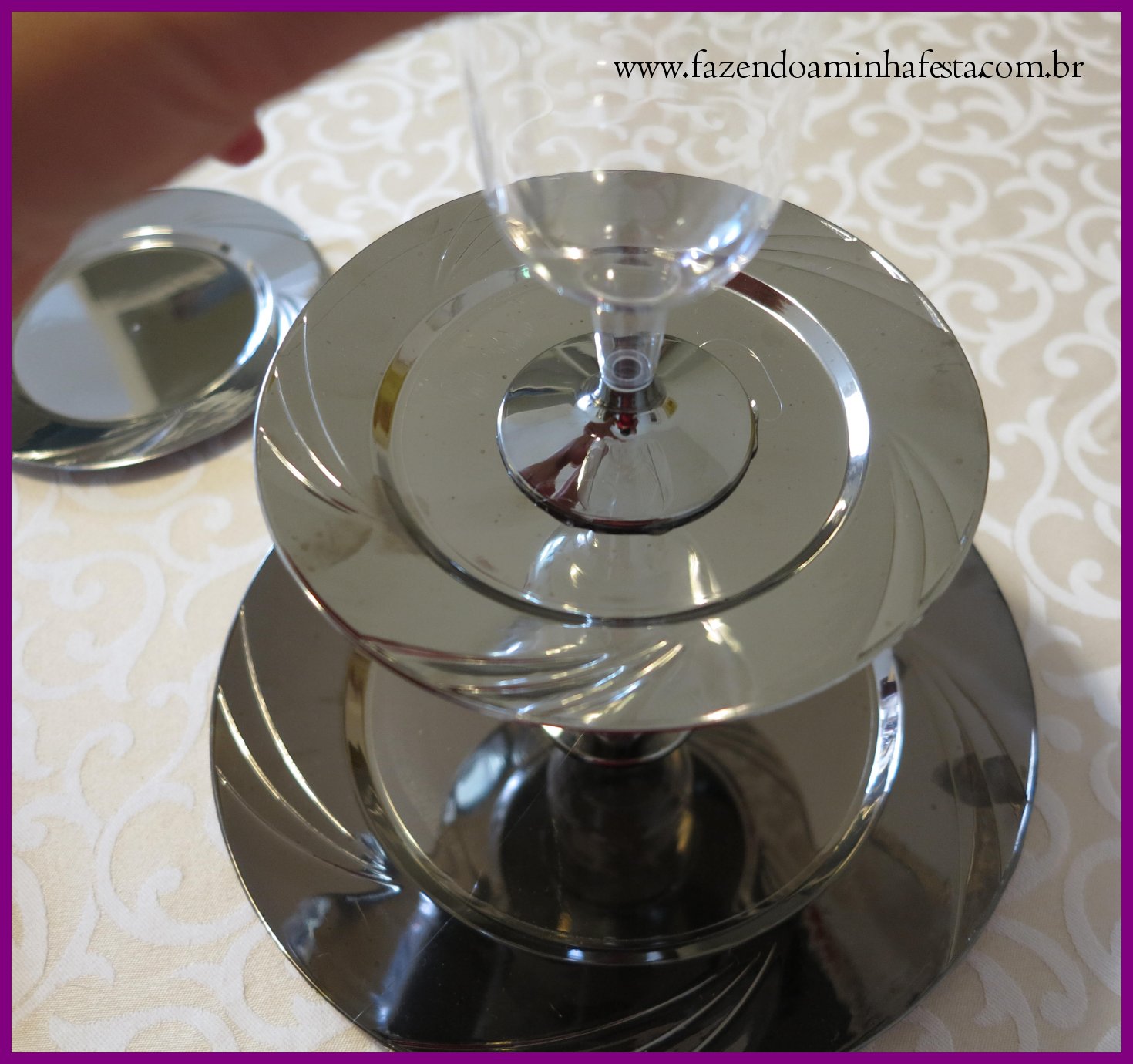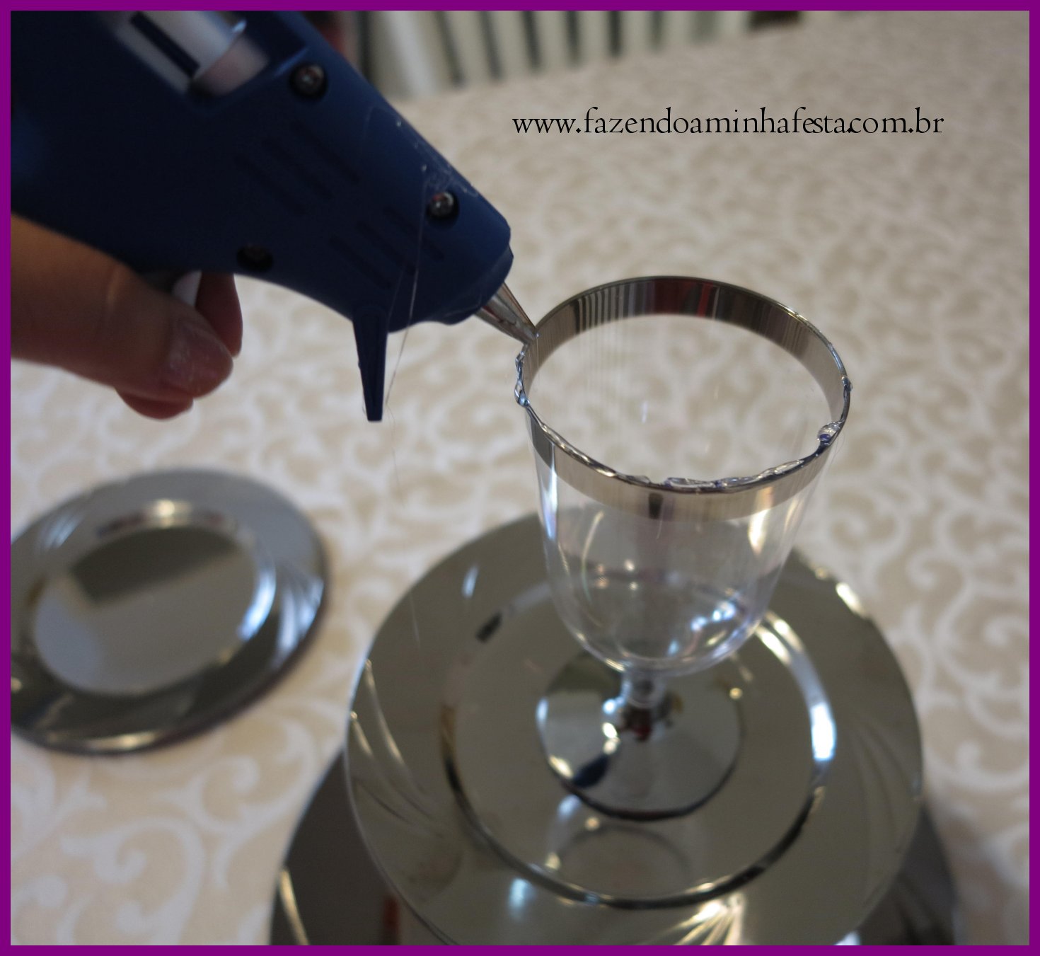 Você vai precisar apenas de cola quente, copos ou taças e pratinhos de festa. Pode ser tudo descartável, na cor da decoração. Também fiz alguns com descartáveis chiques da Decor Plastic, que imitam aço inoxidável, e ficou lindo! E se você vai fazer uma festa mais chique, pode usar pratos de porcelana ou cerâmica, e os pés podem ser feitos com castiçal para velas.