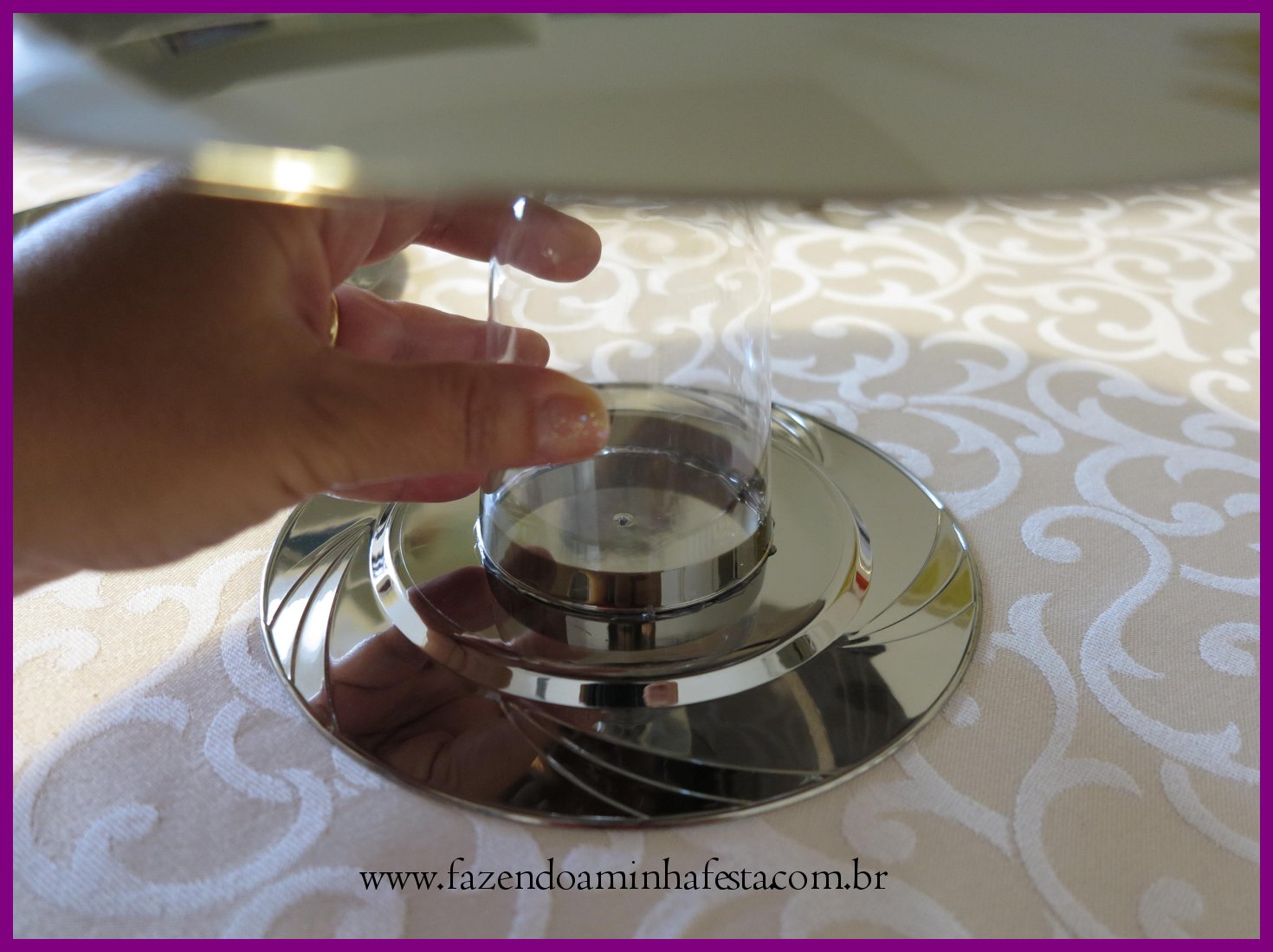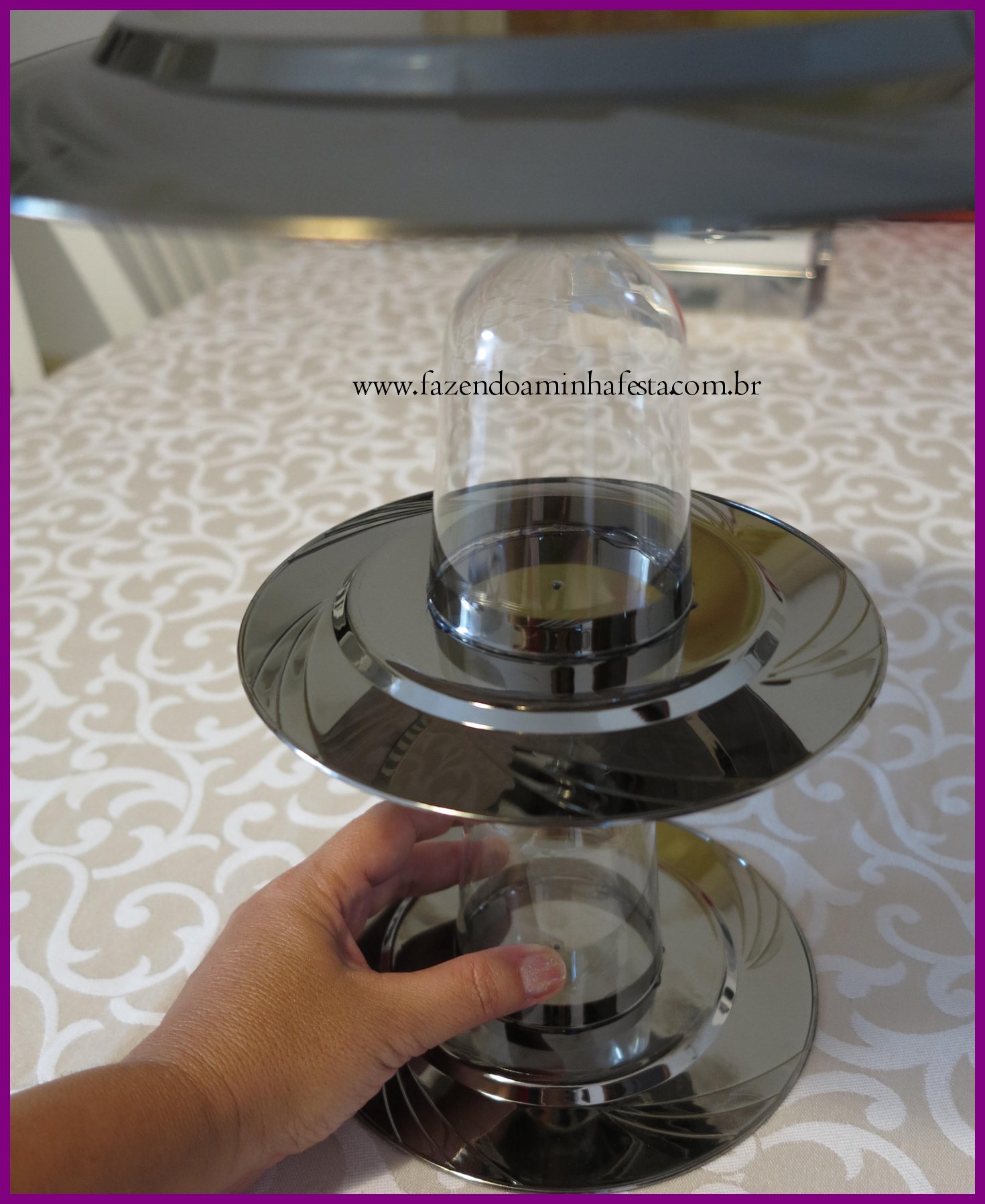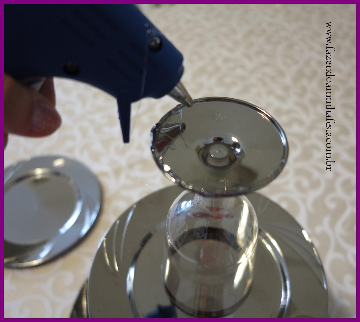 Você vai precisar apenas de cola quente, copos ou taças e pratinhos de festa. Pode ser tudo descartável, na cor da decoração. Também fiz alguns com descartáveis chiques da Decor Plastic, que imitam aço inoxidável, e ficou lindo! E se você vai fazer uma festa mais chique, pode usar pratos de porcelana ou cerâmica, e os pés podem ser feitos com castiçal para velas.